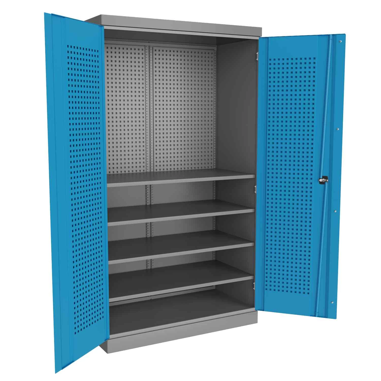 Шкаф оснащен замком «Евролок». Окраска элементов корпуса осуществляется порошковой полимерной краской: RAL 7037 (пыльно-серый), а дверцы RAL 5015 (небесно-синий) – складская программа.