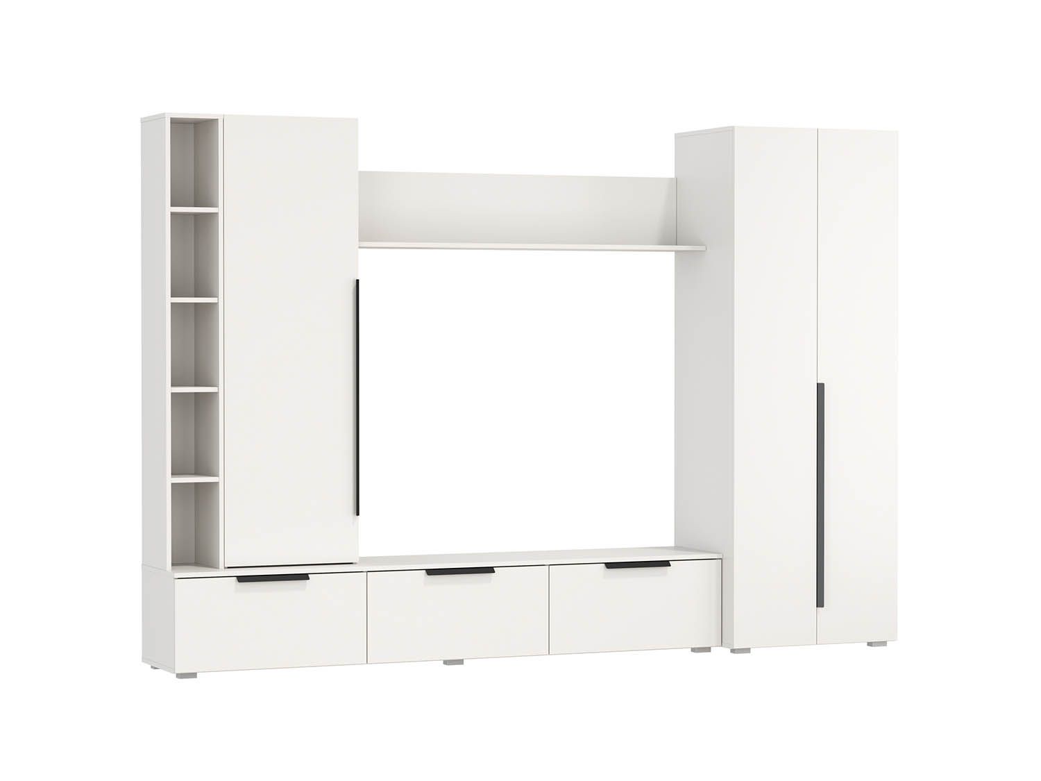 Слева и справа стеллаж с полками и шкаф для одежды, в центре открытая полка и тумба для тв.