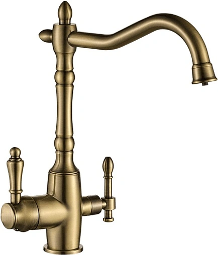 Ретро смеситель в цвете античная бронза. Модель отлично подходит для всех типов классических кухонь. Изделие изготовлено из латуни и имеет два поворотных крана, один из которых предназначен для для подачи горячей и холодной воды, а другой для подачи фильтрованной воды.