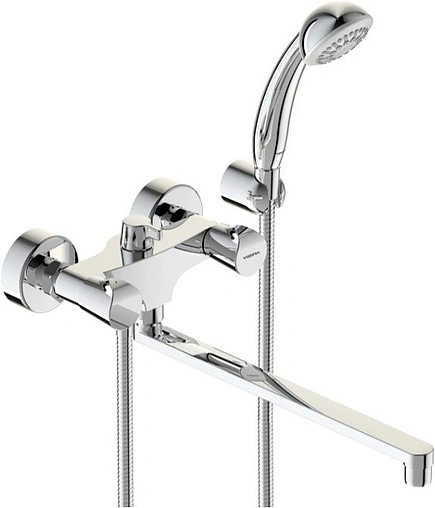 VIDIMA NEO Смеситель для ванны/душа, с керамическим переключателем, монтаж на стандартных эксцентриках (в комплекте: эксцентрики, металлические отражатели, уплотнительные прокладки), трубчатый поворотный излив, длина излива 320 мм, от стены 383 ÷ 387, угол поворота 360˚, аэратор PERLATOR, керамические кранбуксы производства Германии с поворотом 180˚, металлические рукоятки, индикатор холодной/горячей воды, переключение ванна/душ — ручной керамический переключатель, душевой гарнитур в комплекте (душевая лейка Ø70 мм, металлический шланг 1500 мм, держатель для лейки).