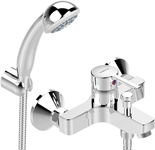 VIDIMA LOGIK Однорукоятковый смеситель для ванны/душа, монтаж на стандартных эксцентриках (в комплекте: эксцентрики, металлические отражатели, уплотнительные прокладки), литой излив 152-157 мм, аэратор PERLATOR, керамический картридж 35 мм, металлическая рукоятка, индикатор холодной/горячей воды, ручное переключение ванна/душ, душевой гарнитур в комплекте (душевая лейка Ø70 мм, металлический шланг 1500 мм, держатель для лейки)