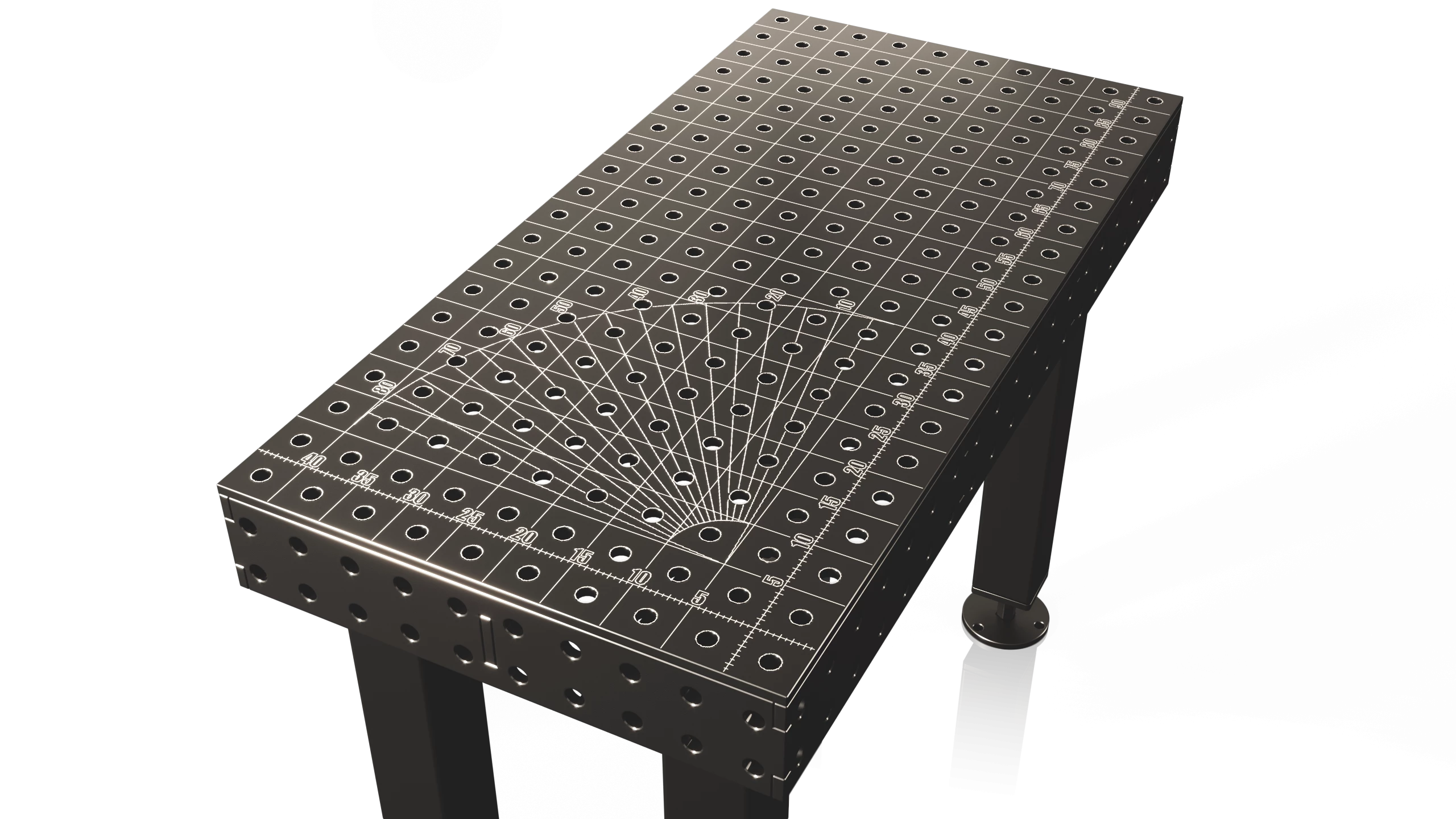 На столешнице нанесена гравировки с горизонтальной и вертикальной оцифрованной линейкой и угловым транспортиром, для выполнения работ с максимальной точностью.