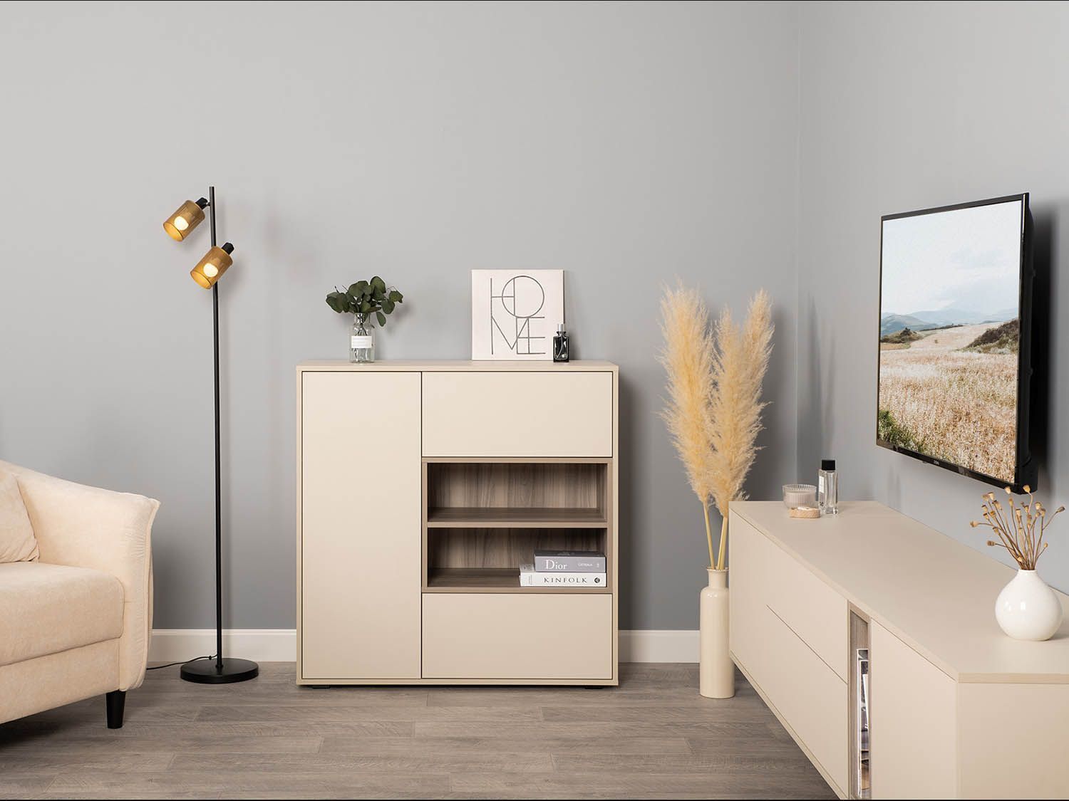 Тумба оборудована 2-я выдвижными ящиками для хранения, открытой нишей двумя секциями с распашными дверцами.
