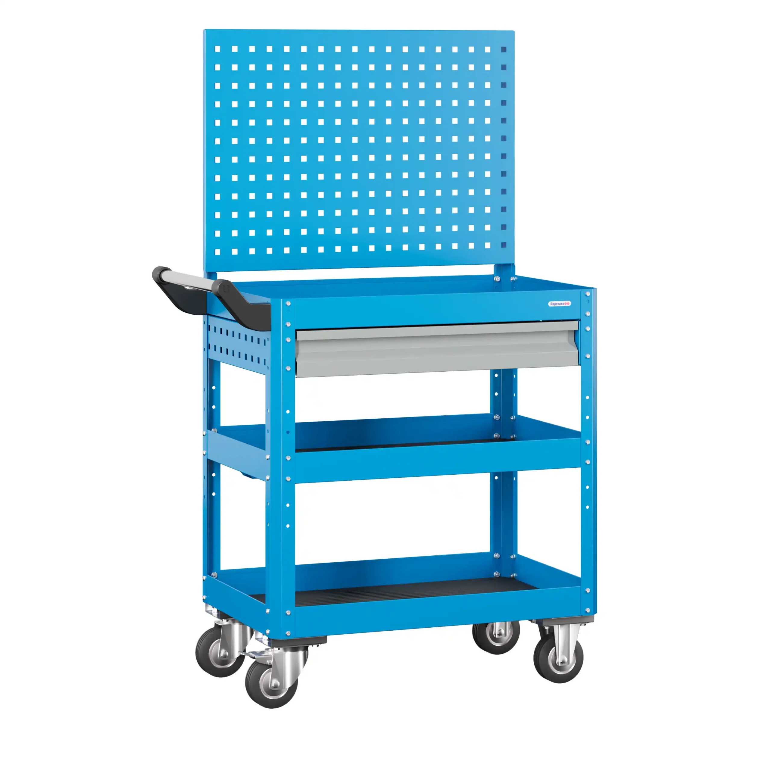 С перфорированной панелью для навесных элементов и выдвижным ящиком на шариковых телескопических направляющих. Комплект резиновых ковриков. Общая равномерно-распределённая нагрузка на тележку — до 100кг. Корпус выполнен из листовой стали толщиной от 0,6 до 1,5мм., покрыт полимерной порошковой краской. Верхняя и средняя полка имеют высоту борта 40мм., нижняя полка имеет высоту борта 60мм