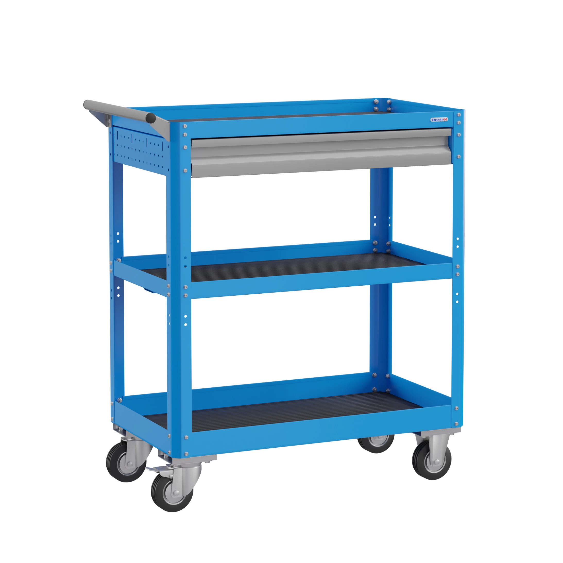 С выдвижным ящиком на шариковых телескопических направляющих. Комплект резиновых ковриков. Общая равномерно-распределённая нагрузка на тележку — до 100кг. Корпус выполнен из листовой стали толщиной от 0,6 до 1,5мм., покрыт полимерной порошковой краской. Верхняя и средняя полка имеют высоту борта 40мм., нижняя полка имеет высоту борта 60мм