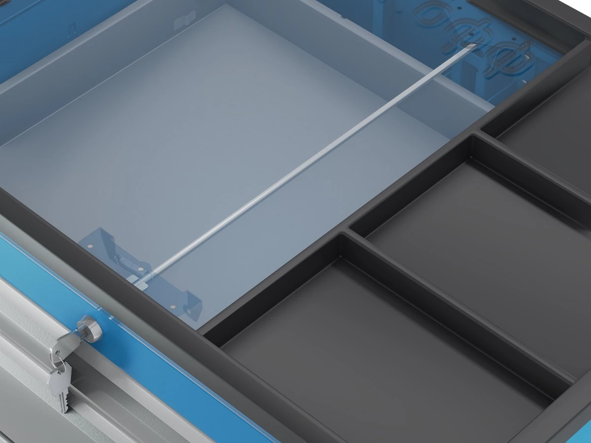 На боковой стенке тележки установлена удобная эргономичная ручка с диаметром трубы 25 мм. Имеется возможность установки ручки с двух противоположных сторон тележки. Все металлические элементы тележки покрыты полиэфирной порошковой краской, обеспечивающей хорошую износостойкость покрытия и стойкость его к моющим средствам и смазочным веществам. Цвет и текстура покрытия корпуса тележки RAL 5015, полуматовое. Цвет и текстура покрытия ящиков тележки RAL 7037, глянцевое. Цвет и текстура покрытия накладок на ящики RAL 9006, глянцевое. На крыше тележки установлен формованный лоток, выполненный из АБС-пластика толщиной 2 мм. В лотке имеется одно большое основное отделение и три малых отделения для хранения метизов и небольшого инструмента. Тележка снабжена центральным замком с поворотом ригеля 180 градусов, который закрывает одновременно все ящики. Замок неподвижно и прочно закреплен на корпусе тележки. В комплекте имеется два ключа. Тяга замка подпружинена. Габаритные размеры тележки с учетом колес, лотка и ручки (ВхШхГ), не более: 800 х 780 х 490 мм (при расположении поворотных колес вдоль тележки со стороны ручки). Тележка сертифицирована по ГОСТ 16371-2014. «Мебель. Общие технические условия», а также имеет декларацию соответствия ТР ТС 025/2012 «О безопасности мебельной продукции». Максимально допустимая масса груза, равномерно распределенного по поверхности любого выдвижного ящика 30 кг. Максимально допустимая масса груза, равномерно распределенного по крыше тележки 25 кг. Максимально допустимая масса размещаемого груза в тележке 220 кг. В тележке инструментальной TNC 795.5 Р установлены три малых и два средних ящика. Внутренние размеры малых ящиков: 60 х 561 х 392 мм. Внутренние размеры средних ящиков: 135 х 561 х 392 мм.