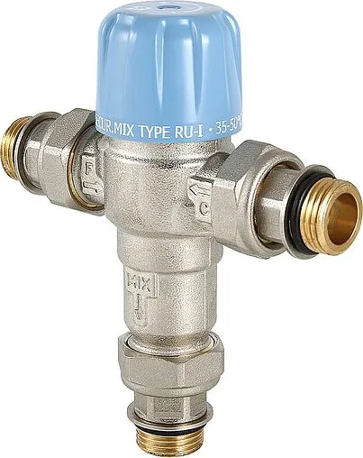(VT.MT10RU) Трехходовой термостатический смесительный клапан с изменяемой в диапазоне от 30 до 50 °C настройкой. Предназначен для автоматического поддержания заданной температуры в системе горячего водоснабжения. Ее превышение исключается даже при полном отключении холодной воды, что позволяет использовать смеситель в школах, детских садах, других общественных зданиях. Термостат оперативно реагирует на изменение температуры и давления входящих потоков. Клапан выполнен из качественной латуни, никелирован. Встроенный термочувствительный элемент – жидкостного типа (наполнен толуолом). Патрубки клапана соединены накидными гайками с полусгонами. Резьба присоединений – внешняя. Входы смесителя комплектуются обратными клапанами из нейлона. Максимальная температура на входе горячей воды – 90 °C, допустимое рабочее давление входных потоков – до 10 бар.