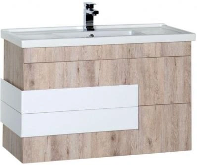 Тумба с раковиной Акванет Мадейра представлена в современном дизайне с нестандартным покрытием. В отделке использованы ламинированные плиты под натуральное дерево оттенка «дуб кантри». Широкие ручки с покрытием «белый глянец» удачно гармонируют с цветом раковины и делают мебель двухцветной. Традиционно, ящики закрываются очень плавно и бесшумно, чему способствует специальный доводчик. Тумба укомплектована раковиной-столешницей из санитарной керамики высокого качества.