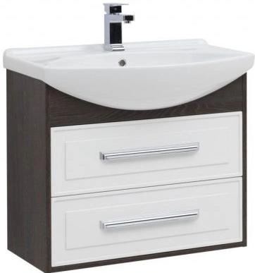Тумба с раковиной Aquanet Остин 75 в цвете «дуб кантербери/белый» чрезвычайно эффектно смотрится благодаря яркому контрасту шоколадных деревянных деталей корпуса в цвете «дуб кантербери» с белыми глянцевыми фасадами выдвижных ящиков со строгой фрезеровкой. Лаконичные хромированные ручки подчеркивают элегантность узора на фасаде. Особенно хороша на этом фоне белоснежная керамическая раковина чешского бренда Dreja, которая в этом комплекте является не только функциональной деталью, неотъемлемой частью тумбы, но и декоративным элементом. Тумба шириной 75 см станет настоящим украшением интерьера, выполненного в любом стиле.