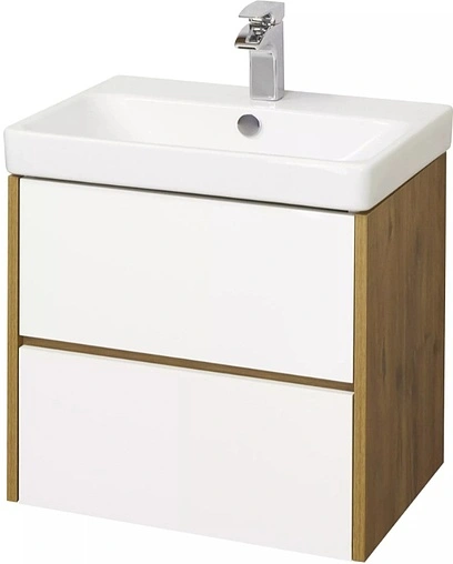 Тумба Сканди 70 выполнена в популярном минималистичном скандинавском стиле. Корпус тумбы выполнен из влагостойкой ЛДСП в декоре натурального дерева, а фасады в белой глянцевой покраске. Конструктивно тумба состоит из 2 вместительных ящиков, установленных на направляющие с интегрированной системой push-to-open для комфортного использования. На тумбе нет выступающих деталей и фурнитуры, открытие ящиков реализовано нажатием на фасад. Тумба комплектуется белоснежной раковиной Адриана от бренда Santek. Тумбу по желанию можно использовать в двух вариантах: как подвесную или дополнительно приобрести опоры