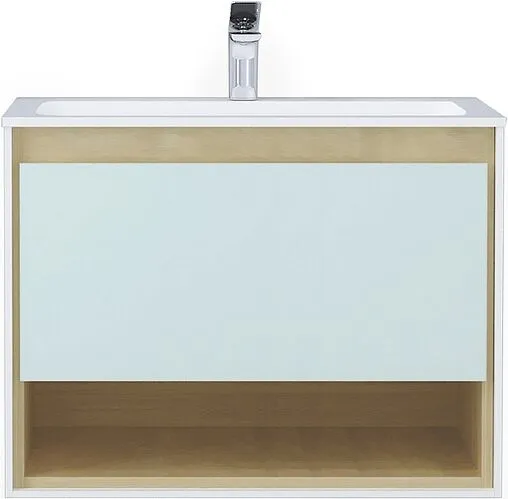 Деликатная структура дерева, укрытая за тонкими плоскостями белого корпуса, мягко вписывается в интерьер разных стилей и оттенков, привнося теплоту природы. Зеленоватый оттенок стекла гармонично дополняет текстуру дерева, и придает комплекту современности. Эксклюзивная раковина собственной разработки компании формирует индивидуальный образ.