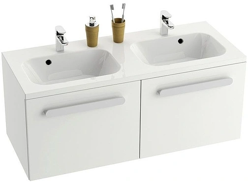 Практичная конструкция внутреннего пространства шкафчика позволяет сохранять порядок среди вещей. Двойным умывальником одновременно могут пользоваться два человека, а шкафчик без проблем может поместить в себе всю необходимую косметику и принадлежности для ванной комнаты. Шкафчик оборудован двумя высокими ящиками (40 см).
