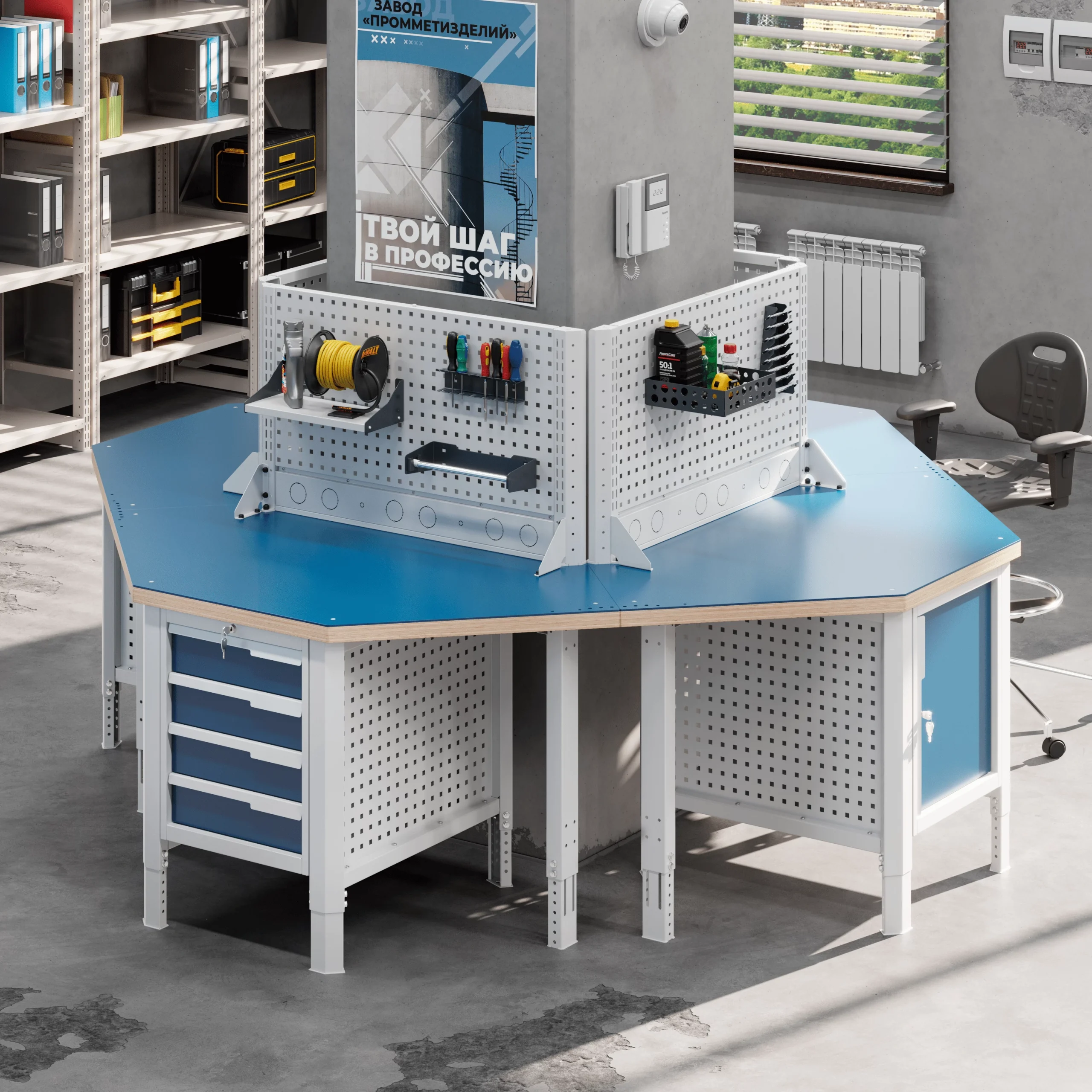 — Доступность: Открытая конструкция верстака обеспечивает легкий доступ к рабочей поверхности со всех сторон, что повышает эффективность работы.
