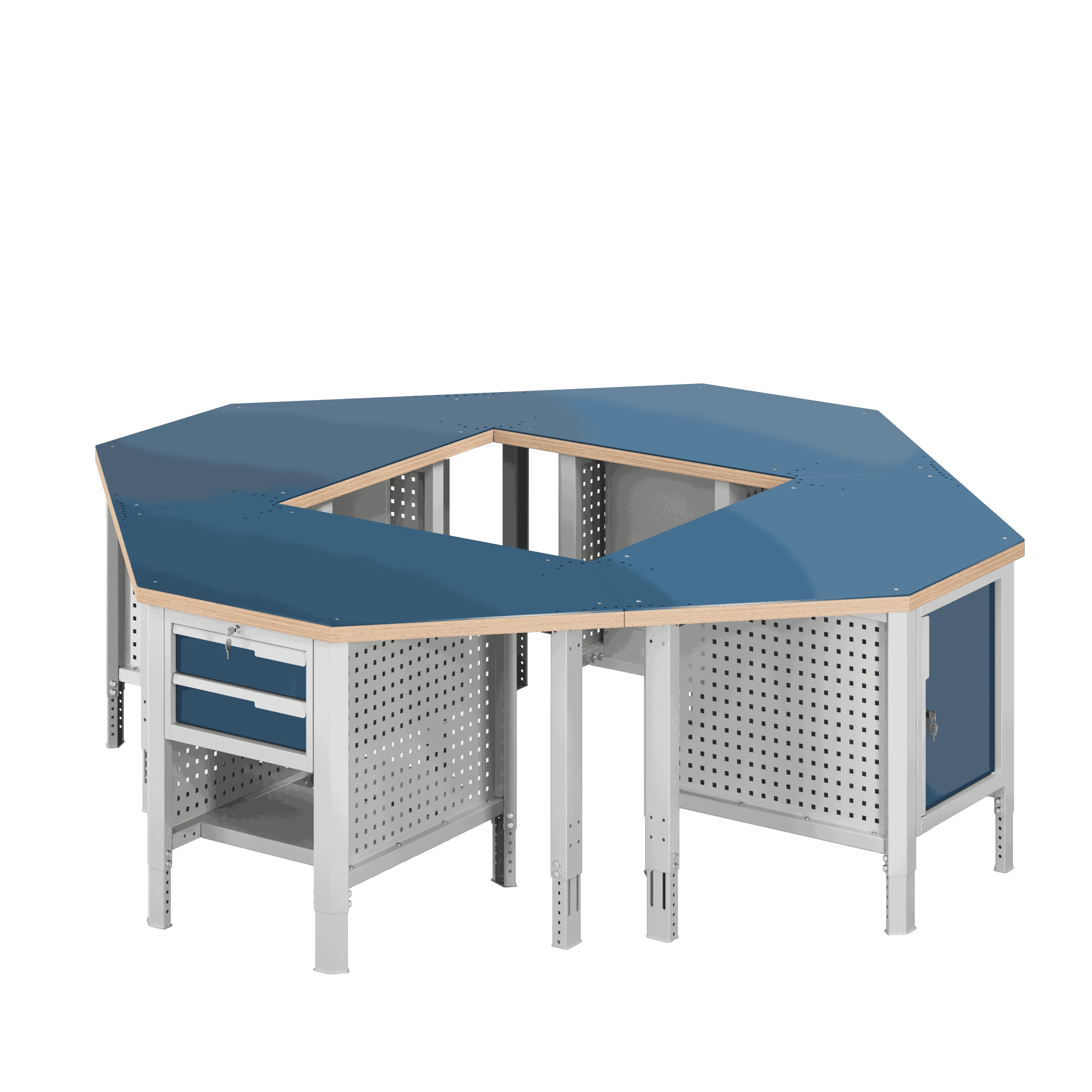 Островной верстак серии Constructor U6X, состоящий из четырех столешниц и модулей CS, представляет собой универсальное решение для создания просторного и функционального рабочего пространства. Этот верстак идеально подходит для мастерских, где требуется доступ к рабочей поверхности со всех сторон.