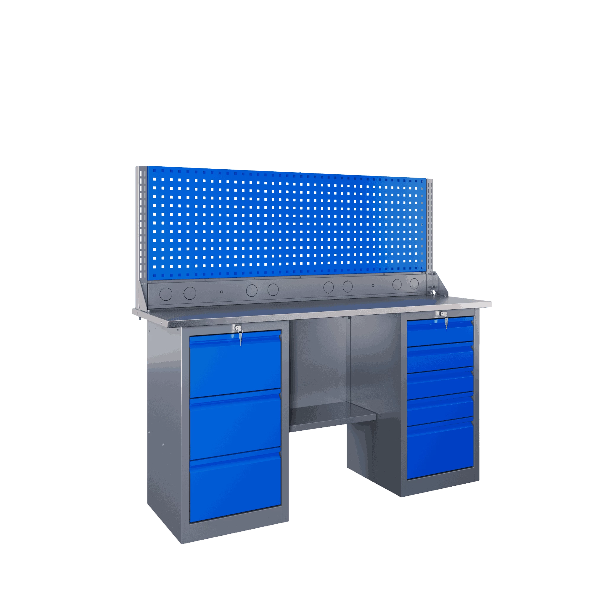 Самые компактные верстаки с глубиной столешницы 500 мм. Благодаря небольшой глубине, такие верстаки легко размещаются в ограниченных пространствах, например, в гаражах, мастерских и тд. Несмотря на компактные размеры, верстаки могут быть оснащены полками, ящиками и держателями для инструментов, что помогает поддерживать порядок и быстро находить нужные предметы.
