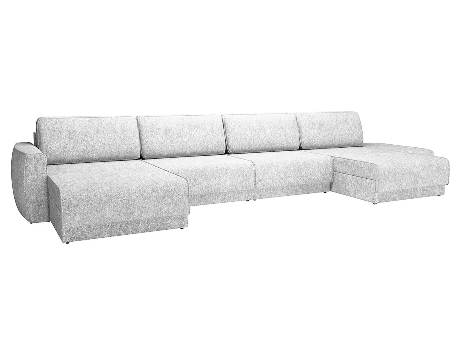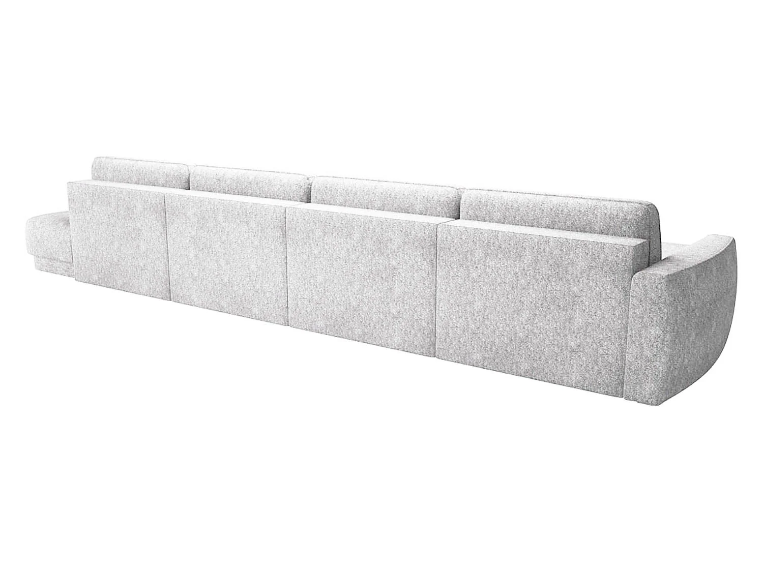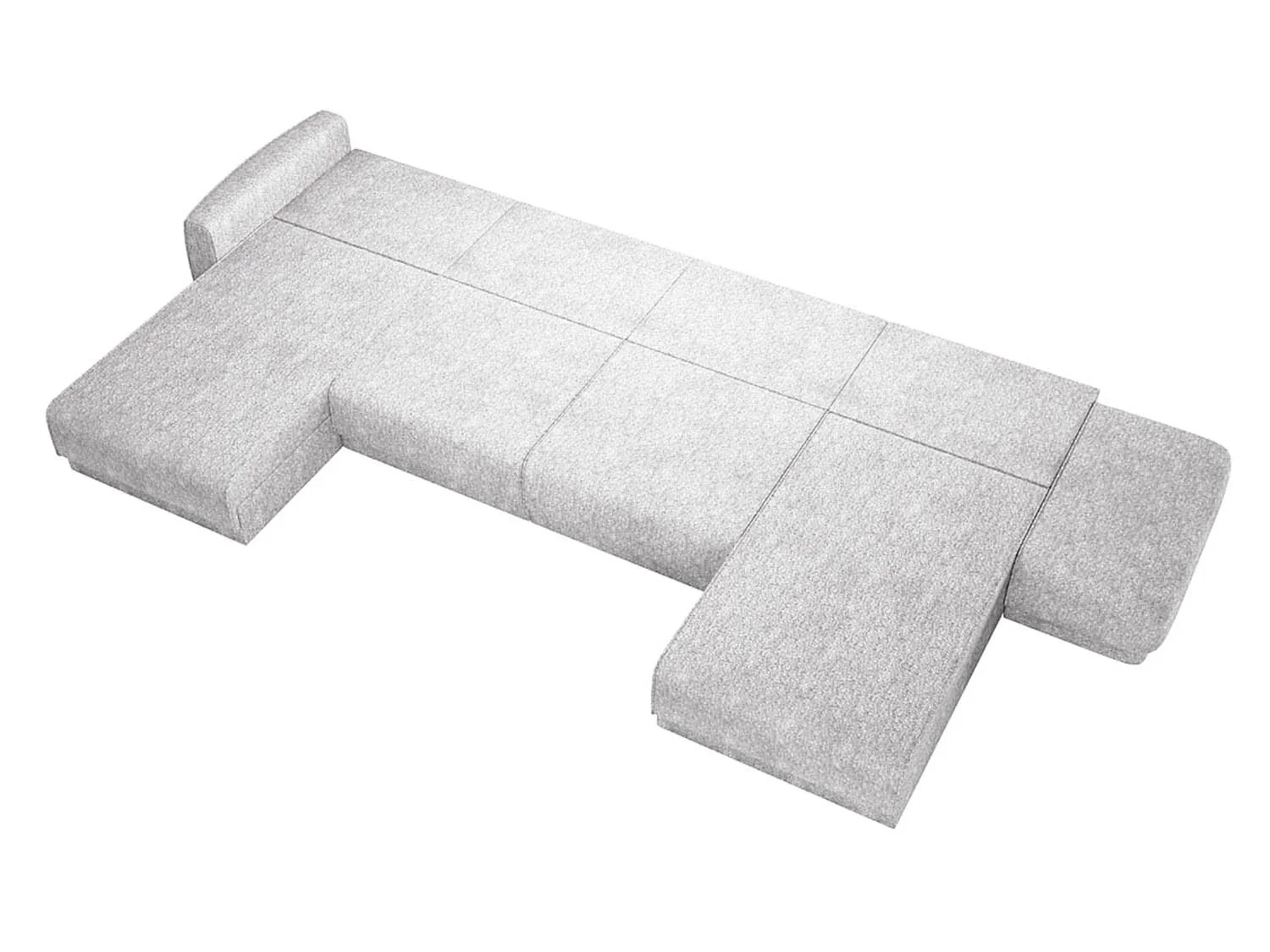 Диван имеет угловую П-образную конструкцию с дополнительным пуфом справа.
