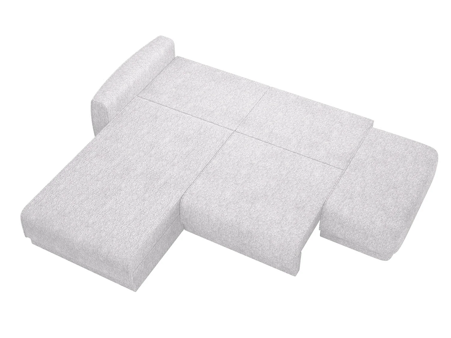 Особенность конструкции — угловая конфигурация и функциональный пуф с левой стороны.